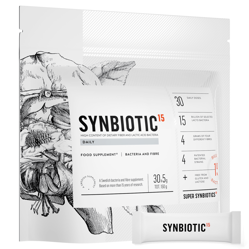 A Swedish food supplement for the gut. A package of Synbiotic contains 30 daily doses in powdered form, which are to be stirred in a glass of water.