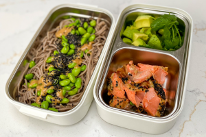 8. Kokoaminen – aloita nuudeleilla, edamame-pavuilla, avokadolla, lohella, tilkalla miso-kastiketta ja ripottele päälle mustia seesaminsiemeniä. Valinnainen – purista päälle vähän tuoretta limemehua ja lisää hieman tuoretta korianteria.
