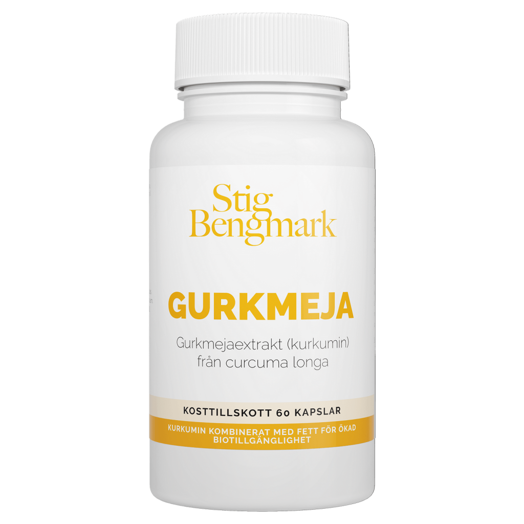 Stig Bengmarks Gurkmeja är helt vegansk, och baserad på gurkmejaextrakt från curcuma longa. En förpackning innehåller 60 kapslar.
